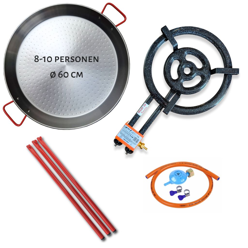 Met de Paella Set Staal 8–10 Personen bereid je moeiteloos grote hoeveelheden paella voor familie, vrienden of feestjes. De royale stalen paellapan van 60 cm, in combinatie met de krachtige 40 cm gasbrander, zorgt voor een snelle en gelijkmatige verhitting.
